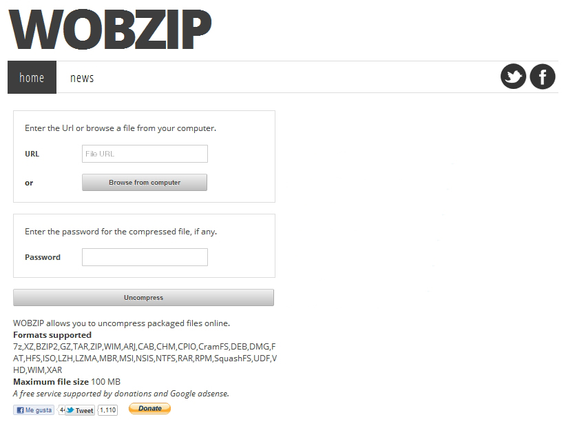 WobZip es un aplicación Web que permite descomprimir archivos en línea. No es necesario inscribirse en el sitio, es completamente gratis y trabaja con archivos de hasta 100 Mb. Los formatos que soporta son 7z, XZ, BZIP2, GZ, TAR, ZIP, WIM, ARJ, CAB, CHM, CPIO, CramFS, FEB, DMG, FAT, HFS, ISO, LZH, LZMA, MBR, MSI, NSIS, NTFS, RAR, RPM, SquashFS, UDF, VHD, WIM yXAR.