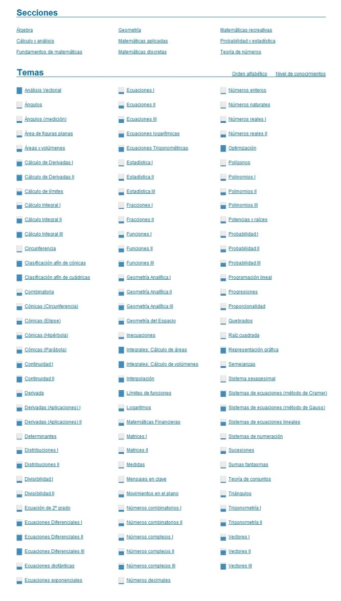 Una vez que se ha ingresado a la red, se puede elegir entre las diferentes secciones disponibles como Álgebra, Cálculo y análisis, Fundamentos de matemáticas, Geometría, Matemáticas aplicadas, Matemáticas discretas, Matemáticas recreativas, Probabilidad y estadística, Teoría de números. Además, dentro de cada una existen una serie de temas entre los que se puede elegir.