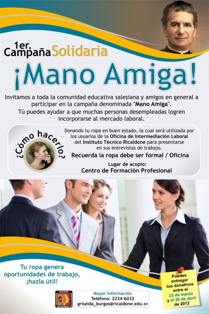 Se ha diseñado un afiche cuyo objetivo es motivar a la comunidad a participar en la 1er. Campaña Solidaria ¡Mano Amiga!. El objetivo principal de esta campaña es solicitar ropa formal, usada y en buenas condiciones, para ayudar a que personas desempleadas logren incorporarse al mercado laboral.
