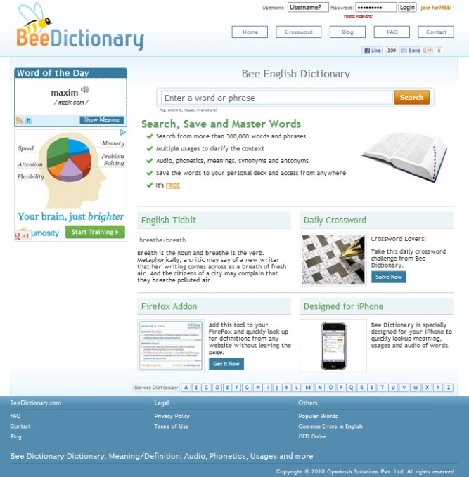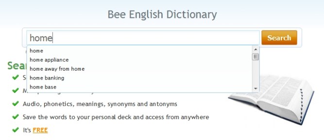 BeeDictionary es un diccionario inglés americano con más de 300,000 palabras y frases disponibles. Presenta además audio, fonética, significados, sinónimos y antónimos.