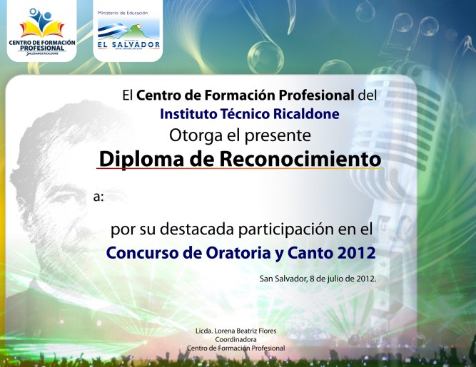 Con el apoyo del Ministerio de Educación de El Salvador, el Centro de Formación Profesional del Instituto Técnico Ricaldone llevará a cabo un concurso de oratoria y canto el próximo 8 de julio. Para tal ocasión se diseñó el siguiente diploma que será entregado a los participantes: