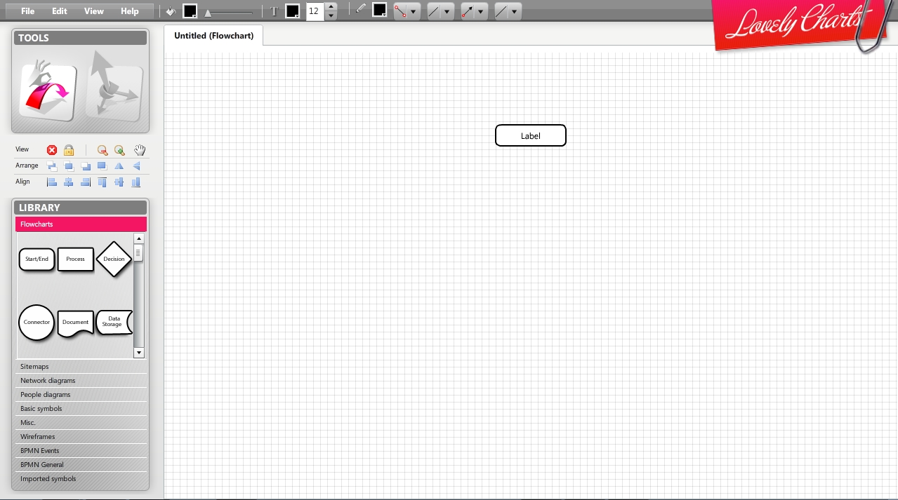 Trabajar con la herramienta es bien intuitivo, ya que basta con arrastrar los elementos del panel izquierdo hacia el área de trabajo para armar el digrama que se necesita. Por ejemplo, la ventana para crear flowcharts es la siguiente: