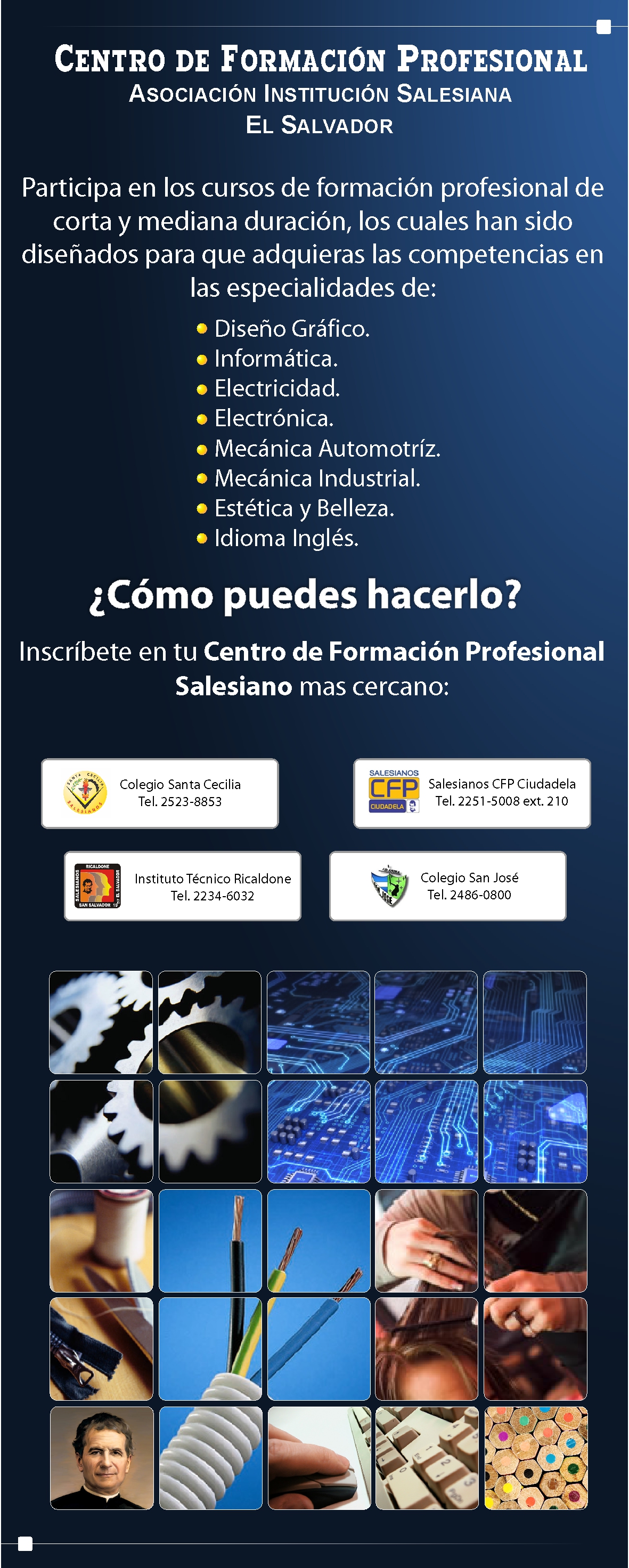 Con el fin de promocionar los diferentes cursos disponibles, el Centro de Formación Profesional de la Asociación Institución Salesiana de El Salvador solicitó el diseño del banner que muestro a continuación: