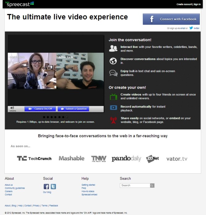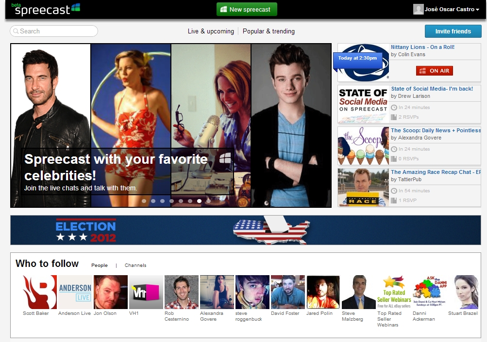 Spreecast es una red social de video. Facilita realizar conversaciones «cara a cara» sobre temas interesantes: deportes, entretenimiento, política o noticias.