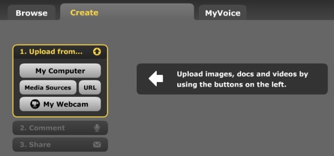 - Dar clic en el botón Upload from… para cargar los contenidos que se deseen (imágenes, documentos o videos). Cada contenido es una diapositiva y puede tener un título y una descripción. Al hacer clic en el botón Comment, se pueden incorporar audio, video o mensajes de texto como comentarios.